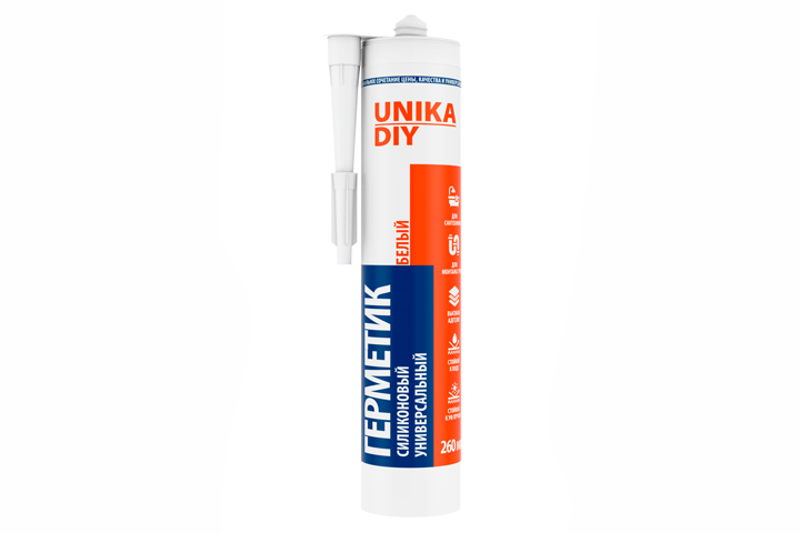 Силиконовый универсальный герметик UNIKA DIY, белый (260 мл, упаковка 1/24) — это многофункциональный уплотнительный материал, предназначенный для герметизации швов, стыков и соединений как внутри помещений, так и на улице. Белый цвет обеспечивает аккуратный и эстетичный шов, подходящий для различных поверхностей. Герметик обладает высокой адгезией к стеклу, керамике, металлу, пластику, дереву и другим строительным материалам. После затвердевания он остаётся эластичным, водостойким и устойчивым к атмосферным воздействиям, что обеспечивает долговечность и надёжность герметизации.