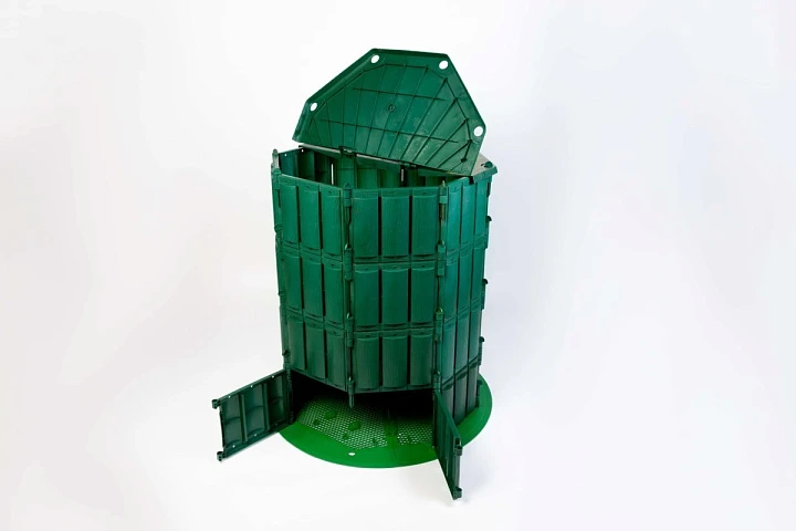 Конструкция оснащена крышкой, исключающей попадание осадков и сниженной теплопотерей, а также удобной дверцей для извлечения готового компоста. Не требует сборки с использованием инструмента и рассчитан на многолетнюю эксплуатацию.